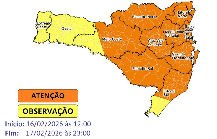 Na segunda-feira (16) e na terça-feira (17), o calor e a instabilidade ganham força, favorecendo temporais mais abrangentes. Há risco moderado a alto para ocorrências associadas a alagamentos, enxurradas e deslizamentos, especialmente nas áreas do Litoral e do Vale do Itajaí.