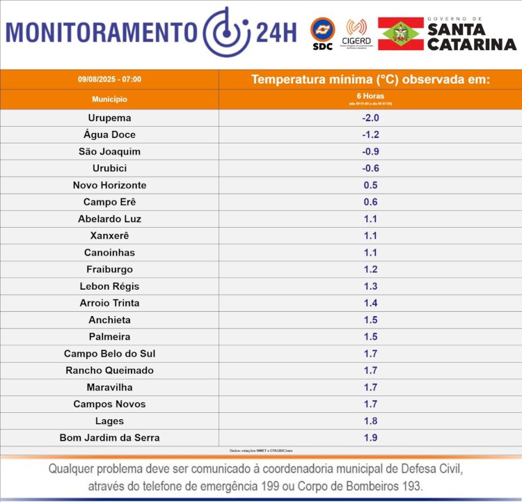 DADOS REGISTRADOS DC/SC 09/08 08:06 - MENORES TEMPERATURAS REGISTRADAS NAS ÚLTIMAS 6 HORAS